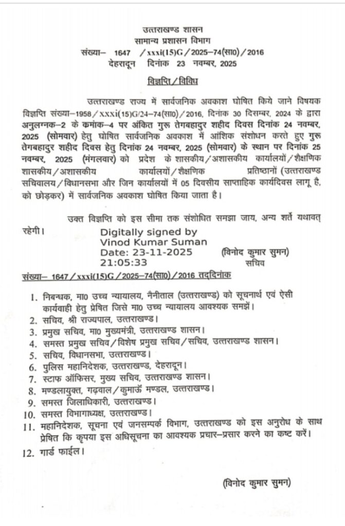 राज्यउत्तराखंड उत्तराखंड में 25 तारीख को रहेगा अवकाश आदेश जारी By nrnews - November 23, 2025 0 10 Share Facebook Twitter Pinterest WhatsApp Tumblr उत्तराखंड में गुरु तेग बहादुर शहीदी दिवस यानी 24 नवंबर को घोषित सार्वजनिक अवकाश में संशोधन किया गया है. अब यह अवकाश अगले दिन यानी 25 नवंबर को होगा. ऐसे में अब 24 नवंबर की जगह 25 नवंबर को प्रदेशभर में अवकाश रहेगा.