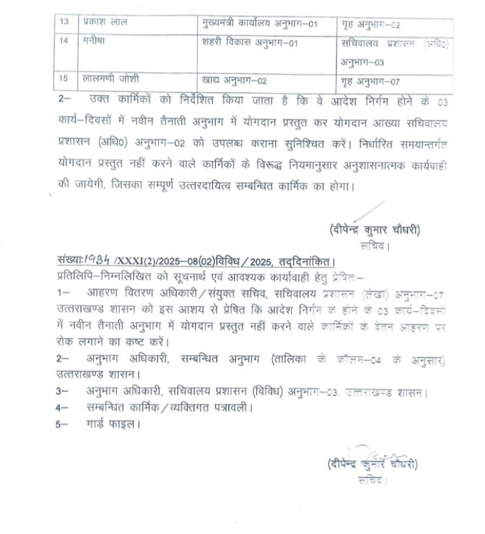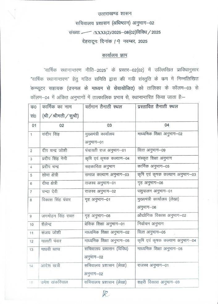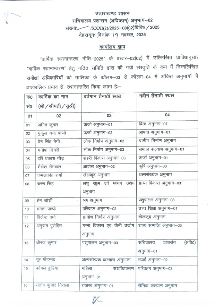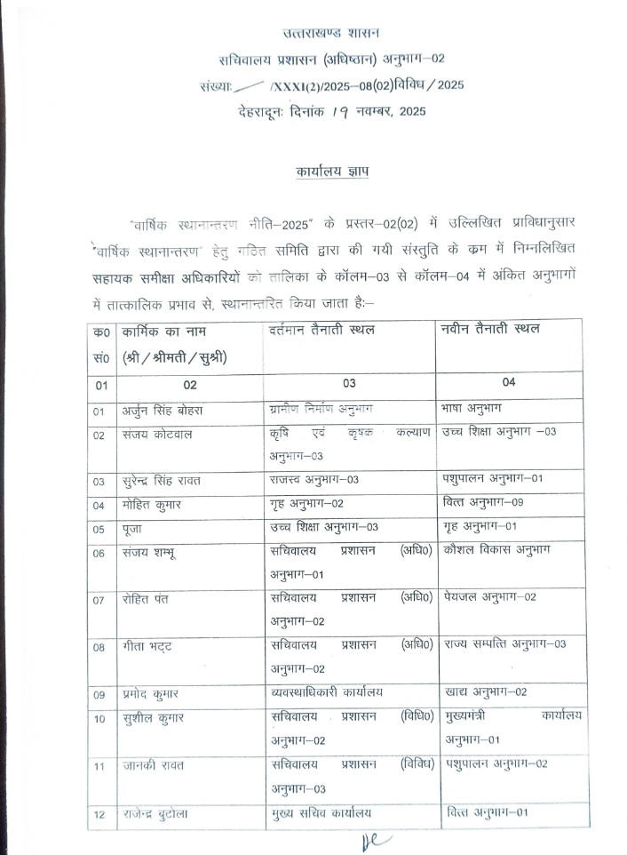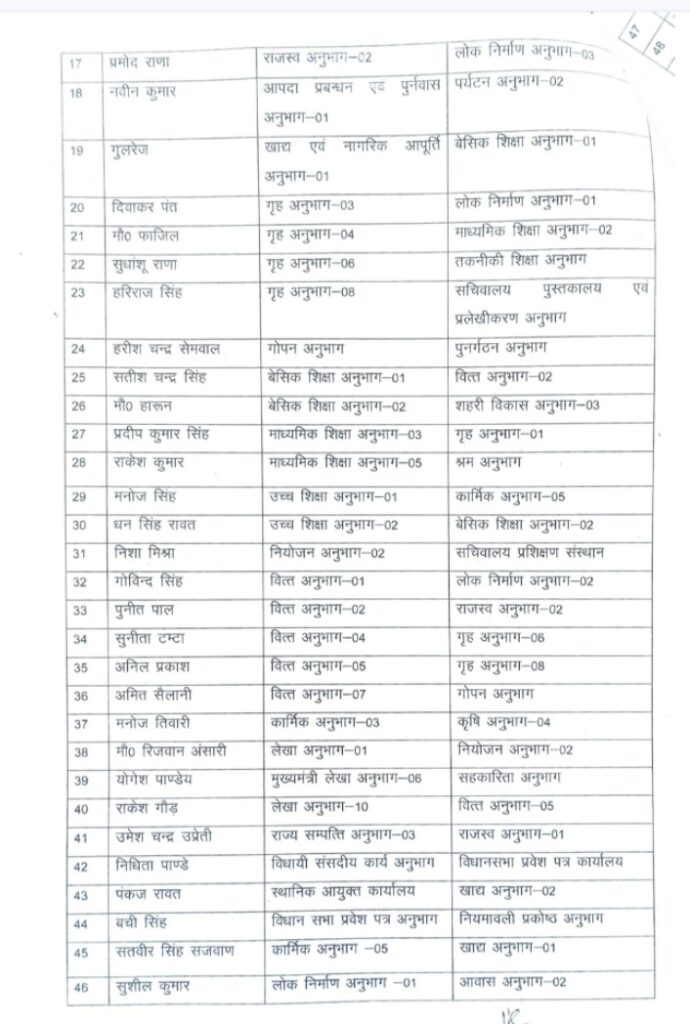 हरिद्वार,उत्तराखंड सचिवालय में पहली बार तबादला नीति से बड़ी संख्या में तबादले हुए हैं। सचिवालय सेवा के 49 समीक्षा अधिकारी, 15 सहायक समीक्षा अधिकारी, 31 कंप्यूटर ऑपरेटर के तबादला आदेश जारी हुए है। बता दें कि पिछले दिनों ही सचिवालय में तबादला नीति लागू हुई थी