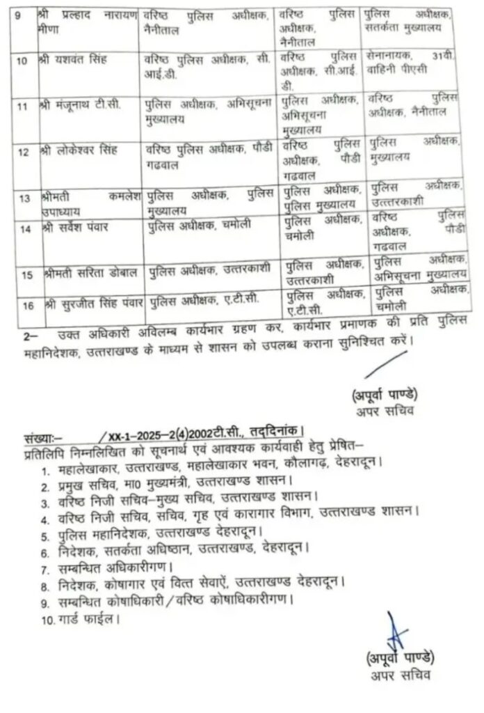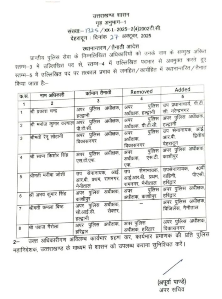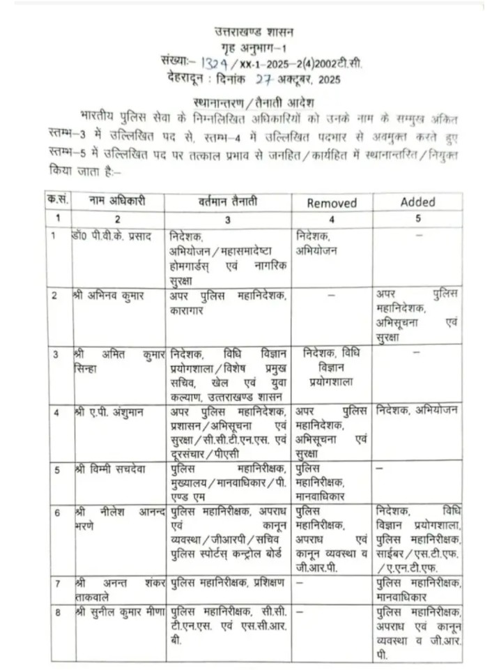 राज्यउत्तराखंड उत्तराखंड,16 आईपीएस और आठ पीपीएस अधिकारियों के तबादले, चार जिलों के कप्तान भी बदले,अभय कुमार सिंह को एसपी सिटी हरिद्वार की जिम्मेदारी दी गई By nrnews - October 27, 2025 0 7 Share Facebook Twitter Pinterest WhatsApp Tumblr हरिद्वार,