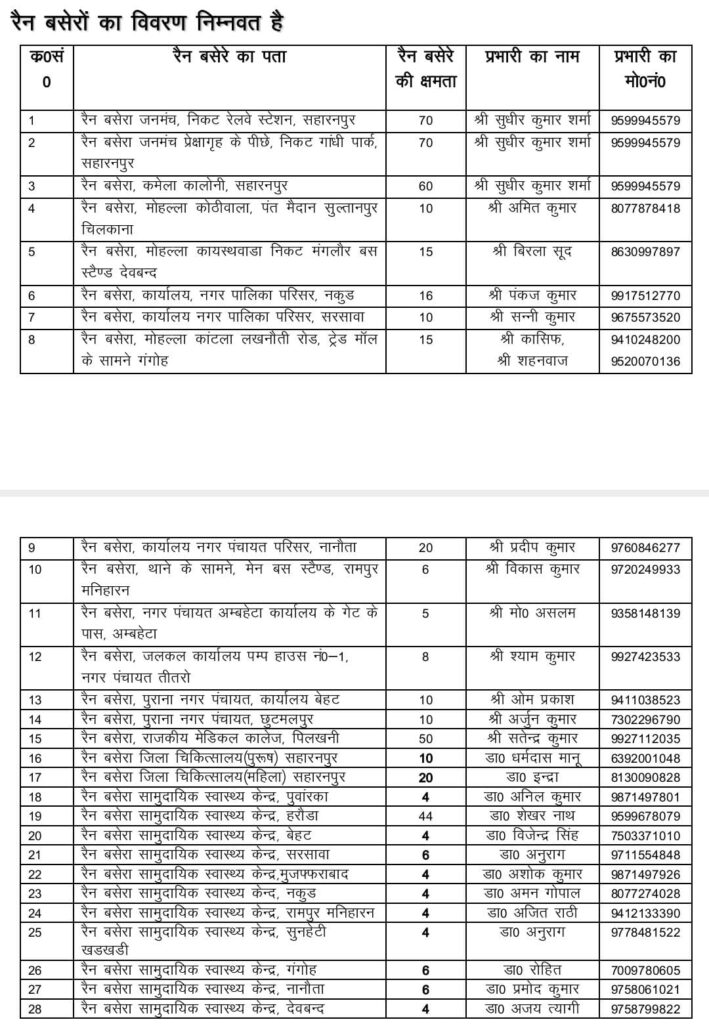 अपर जिलाधिकारी वित्त एवं राजस्व सलिल कुमार पटेल ने बताया कि जनपद में किसी भी व्यक्ति को रैन बसेरे की आवश्यकता होती है तो सीधे नजदीकी रैन बसेरे में जा सकता है अथवा अपने मोबाईल फोन से कन्ट्रोल रूम के फोन नम्बर 0132-2723971 या टोल फ्री नम्बर 1077 पर सम्पर्क कर अपने आस-पास के रैन बसेरे की जानकारी प्राप्त कर मदद ले सकता है। जनपद में निराश्रित एवं असहाय व्यक्तियों के रात्री विश्राम के लिए कुल 28 रैन बेसरों की व्यवस्था की गयी है। जिसमें नगर निगम सहारनपुर द्वारा 03 रैन बसेरे व जनपद की सभी नगर पालिका परिषदों, नगर पंचायतों द्वारा अपने क्षेत्रान्तर्गत 01-01 कुल 11 रैन बसेरे तथा जिला पंचायत, सहारनपुर द्वारा राजकीय मेडिकल कालेज में रैन बसेरे की स्थापना की गयी है। इसके अतिरिक्त जिला पुरूष चिकित्सालय सहारनपुर एवं जिला महिला चिकत्सिालय तथा जनपद के सभी समुदायिक स्वस्थ्य केन्द्र में 1-1 रैन बसेरे की स्थापना की गई है। इस प्रकार जनपद में कुल 28 रैन बसेरे बनाये गये है, जिसमें 495 लोगों के रहने की क्षमता है। इसके अतिरिक्त जनपद में निराश्रित एवं असहाय व्यक्तियों को ठण्ड से बचाव के लिए 427 स्थानों पर अलाव जलाने की व्यवस्था भी किया गया है।