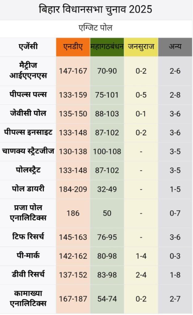 बिहार में दोनों चरणों के मतदान समाप्त होने के बाद अब तक 11 एग्जिट पोल अनुमान सामने आ चुके हैं। मैट्रिज आईएएनएस, पीपल्स पल्स, जेवीसी पोल, पीपल्स इनसाइट, चाणक्य स्ट्रैटजीज, चाणक्य स्ट्रैटजीज, पोलस्ट्रैट, पोल डायरी, प्रजा पोल एनालिटिक्स, टीआईएफ रिसर्च, पी-मार्क और डीवी रिसर्च के अनुमानों में एनडीए को प्रचंड बहुमत मिलने के आसार हैं।
