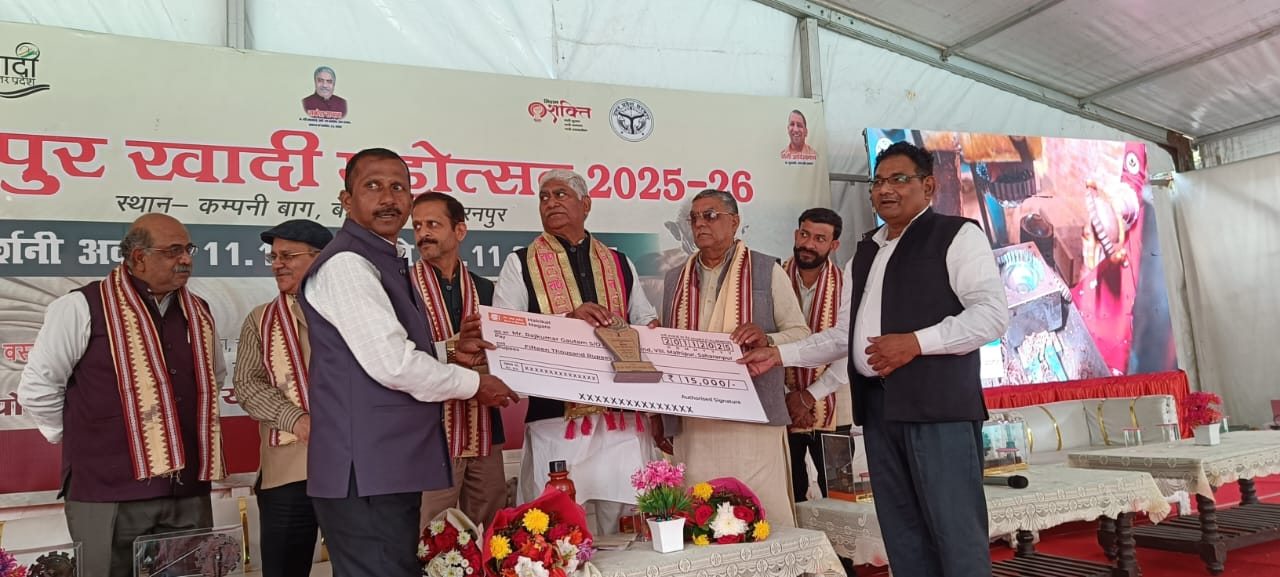 कम्पनी बाग में 11 नवम्बर से 20 नवम्बर तक आयोजित प्रदर्शनी का राज्य मंत्री जसवंत सैनी द्वारा विभिन्न स्टालों का भ्रमण किया गया । प्रदर्शनी में आयुर्वेदिक दवाइयां, अचार मुरब्बा, सूती वस्त्र, सजावटी लकडी के सामान, सिल्क साडी, कश्मीरी शॉल, शुद्ध शहद प्रदर्शनी में आयी ग्रामोद्योगी इकाईयों द्वारा प्रदर्शित किये गये । प्रदर्शनी में सामुदायिक सेवा संस्थान, महाराष्ट्र की सिल्क की साडी, बद्री विशाल वूलन गारमेंटस नौगांव, उत्तरकाशी के खादी वस्त्र, आर. के. हैण्डीक्राफ्ट, जम्मू-कश्मीर के गर्म शश्वल, लेडिज गर्म सूट, भदोही, उ.प्र.से आयी कालीन एवं कारपेट की इकाई प्रदर्शनी में आ रहे पुरूषों एवं महिलाओं के आकर्षण का मुख्य केन्द्र रही। इस आयोजन में कई प्रतिष्ठित खादी संस्थानों ने अपने स्टॉल लगाए, जहां खादी वस्त्रों की अच्छी बिक्री हुई। इसके अलावा, उत्तर प्रदेश के विभिन्न जनपदों से आए कारीगरों ने अपने उत्पादों का प्रदर्शन किया। प्रदर्शनी में सर्वश्रेष्ठ प्रदर्शन करने वाले विक्रेताओं को सम्मानित किया गया। प्रदर्शनी में सर्वश्रेष्ठ प्रदर्शन करने वाले और प्रथम स्थान पर आने वाले संत विनोबा भावे सेवा संस्थान के संचालक प्रदीप पंवार को राज्य मंत्री जसवंत सैनी द्वारा पुरस्कार देकर सम्मानित किया गया । संत विनोबा भावे सेवा संस्थान के संचालक प्रदीप पंवार ने बताया कि उ.प्र. खादी तथा ग्रामोद्योग बोर्ड द्वारा सहारनपुर खादी महोत्सव 2025-26 मे उनके संस्थान को प्रथम स्थान मिला है। जिसका उनको गर्व है। उन्होंने कहा कि इस जीत मे संत विनोबा भावे सेवा संस्थान के सभी लोगों की भागीदारी है। संत विनोबा भावे सेवा संस्थान के संचालक प्रदीप पंवार ने बताया कि उ.प्र. खादी तथा ग्रामोद्योग बोर्ड द्वारा द्वारा पिछले खादी महोत्सव मे उनके संस्थान ने प्रथम स्थान प्राप्त किया था।परिक्षेत्रीय ग्रामोद्योग अधिकारी प्रदीप कुमार, सौरभ कुमार सहित अन्य गणमान्य लोग उपस्थित रहे।