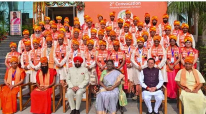 हरिद्वार,भारत की राष्ट्रपति द्रौपदी मुर्मू रविवार को हरिद्वार में पतंजलि विश्वविद्यालय के दूसरे दीक्षांत समारोह में शामिल हुईं, एयरपोर्ट पर सीएम धामी और राज्यपाल लेफ्टिनेंट जनरल (सेनि) गुरमीत सिंह ने राष्ट्रपति का पुष्पगुच्छ देकर स्वागत किया। इसके बाद वह हरिद्वार के लिए रवाना हुईं। राष्ट्रपति द्रौपदी मुर्मू हरिद्वार स्थित पतंजलि विश्वविद्यालय के दीक्षांत समारोह में शामिल हुईं। उन्होंने समारोह में बतौर मुख्य अतिथि शामिल होकर छात्र-छात्राओं को डिग्री और मेडल दिए। इस दौरान सीएम और राज्यपाल भी मौजूद रहे। इस अवसर पर राष्ट्रपति ने कहा कि भारत की महान विभूतियों ने मानव संस्कृति के विकास में अमूल्य योगदान दिया है। ऋषियों में महानतम महर्षि पतंजलि ने योग के माध्यम से मन की, व्याकरण के माध्यम से वाणी की और आयुर्वेद के माध्यम से शरीर की अशुद्धियों को दूर किया। उन्हें यह जानकर प्रसन्नता हुई कि पतंजलि विश्वविद्यालय महर्षि पतंजलि की महान परंपरा को समाज के लिए सुलभ बना रहा है।