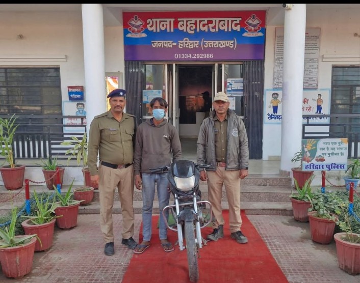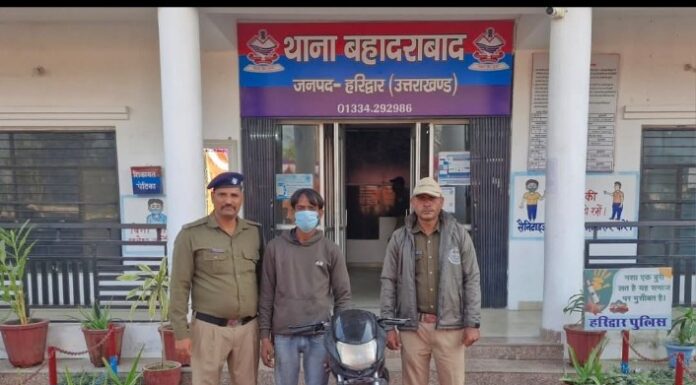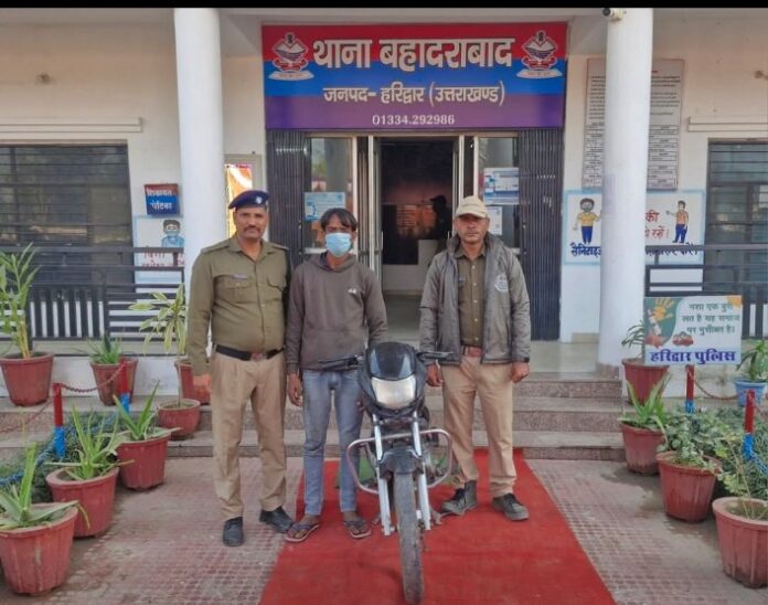 बहादराबाद। कुर्बान पुत्र शमशाद निवासी-ग्राम इक्कड खुर्द थाना पथरी जिला हरिद्वार द्वारा थाना बहादराबाद में तहरीर दी थी अज्ञात बदमाशो द्वारा नहर पटरी बहादराबाद से वादी की मो०सा० लूटकर फरार हो गये है। बाइक लूट की घटना का खुलासा करने के लिए थानाध्यक्ष बहादराबाद के नेतृत्व में पुलिस टीम का गठन किया गया । गठित की गई पुलिस टीम द्वारा आरोपी अरूण पुत्र विक्रम निवासी ग्राम धर्मूपुर थाना खानपुर जिला हरिद्वार को पथरी पुल बहादराबाद से पकड़ा है।