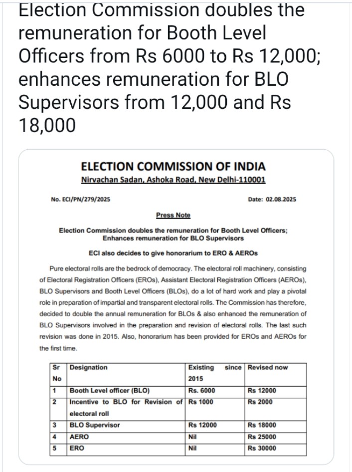 इसी बीच चुनाव आयोग ने एईआरओ और ईआरओ को भी खुशखबरी दी है। EC ने AERO को 25 हजार रुपये और ERO को 30 हजार रुपये प्रतिवर्ष सम्मान राशि देने का भी फैसला किया है। दरअसल, पहले इन पदों पर कोई अलग से मानदेय नहीं था